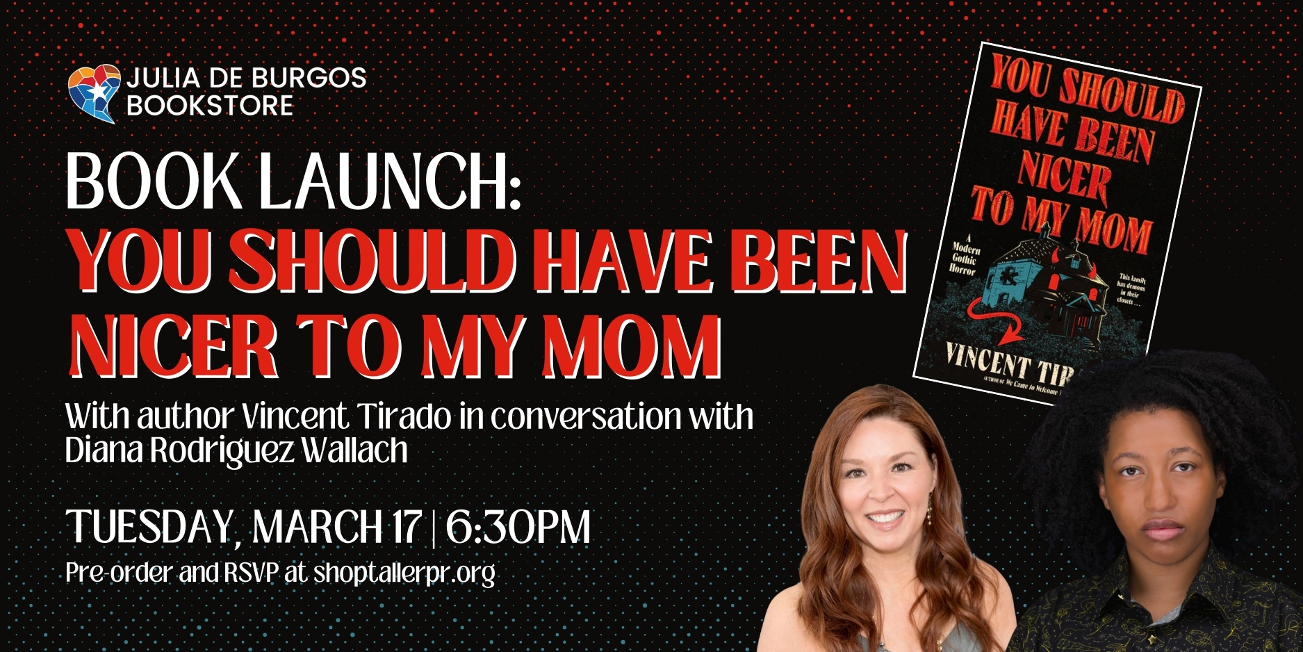Join us to celebrate the launch of YOU SHOULD HAVE BEEN NICER TO MY MOM, a modern gothic horror by local author Vincent Tirado.